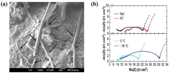 (a) SEM image of a lithium deposit (as indicated by the arrow) on the surface of the anode electrode [64]; (b) electrochemical impedance spectra of the graphite electrodes recovered from the full cells at an SOC of 41% [66].