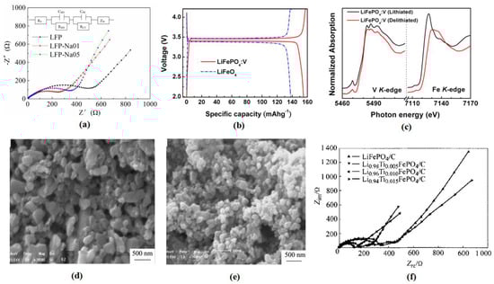 (a) Electrochemical impedance spectra with corresponding equivalent circuit module (inset) for the LiFePO4 and Na-doped LiFePO4 electrodes [76]; (b) charge/discharge curves of LiFePO4: V and pristine LiFePO4 cells over a voltage range of 2.0–4.2 V at a rate of 0.1 C [78]; (c) ex situ normalized XANES spectra at V and Fe K-edge measured at the initial state (containing Fe2+) and the delithiated state (containing Fe3+) of LiFePO4: V at 0.1 C [78]; SEM images of (d) LiFePO4 and (e) Li0.99Y0.01FePO4 [80]; (f) electrochemical impedance spectra of Li1–4xTixFePO4/C cathodes [83].