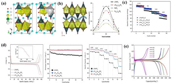 (a) Pure LiFePO4 in a unit cell and 25% vanadium doped into the Fe site of LiFePO4 [89]; (b) the minimum energy path for Li+ diffusion along the b-axis tunnel in pure and doped LiFePO4 with complete lithiation and complete delithiation phases [89]; (c) the cycling performance of LiFe1-xVxPO4/C (x = 0, 0.01, 0.03, 0.05) under varying discharge currents [90]; (d) the first charge/discharge curve, cycling performances (at 29 mA g−1 (0.2 C)) and rate performance of the pure and Ti-doped samples [93]; (e) initial charge/discharge curves of the pure and Ni-doped samples at a 0.1C rate [98].