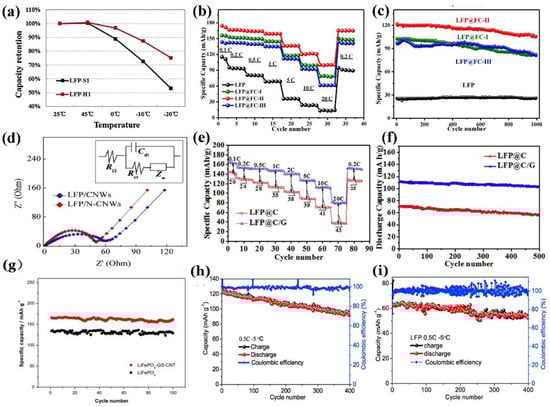 (a) Comparison of the capacity retention of both full cells (LiFePO4/C and LiFePO4/calcium-doped C) at different temperatures [123]; (b,c) rate performance and cycling performance of the LiFePO4@FC-II and other control samples (herein referred to as discharge capacity) [124]; (d) Nyquist plots of the discharge state of approximately 50% SOC with the frequency range of 10−1–106 Hz for the LiFePO4/CNWs and LiFePO4/N-CNWs samples [125]; (e,f) rate performance and cycling performance at 10C of LiFePO4@C and LiFePO4@C/Graphene (herein referred to as discharge capacity) [127]; (g) cycling performance of the pristine LiFePO4 and LiFePO4-GS-CNT composite from 2.5 to 4.0 V at the current density of 10 mA g−1 [128]; (h,i) cycling performance of the LiFePO4/rGO composite and pristine LiFePO4 when cycling at 0.5C under a temperature of −5 °C [129].