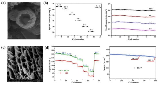 Controlling morphology is another effective method for enhancing the electrochemical performance of LFP. A hollow structure (Figure 15a) provides a shorter pathway for Li+ diffusion and void space to accommodate stress induced by volume changes during cycling, improving electrode stability and Li+ diffusivity, leading to the enhanced rate capability and cycle performance (Figure 15b) [156,157]. In addition, porous electrode materials (Figure 15c) offer a large specific surface area and porous structure, enhancing the contact between electrolyte and active material and the structural stability during the cycling processes and reducing Li+ diffusion length for lithiation/delithiation. Therefore, the porous electrode shows good cycle stability and exceptional rate performance (Figure 15d). They are regarded as promising methods for enhancing LFP electrode performance [158,159].