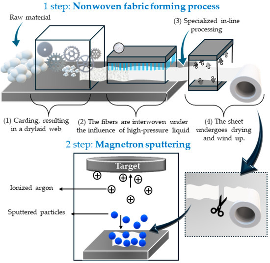 Scheme of aqua-jet/spunlace nonwoven forming and magnetron sputtering process.