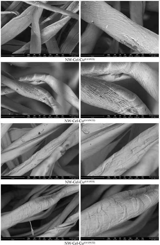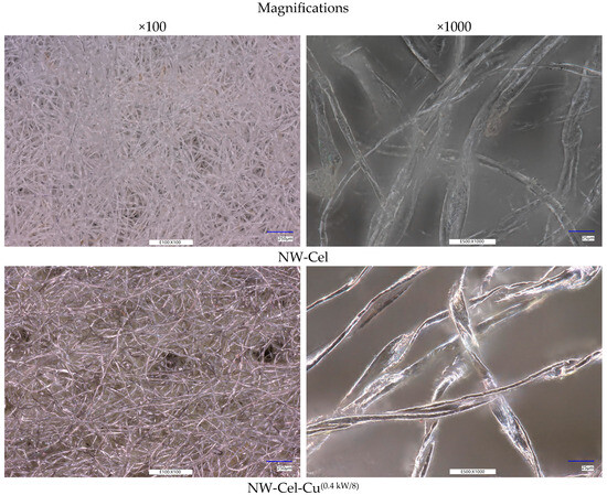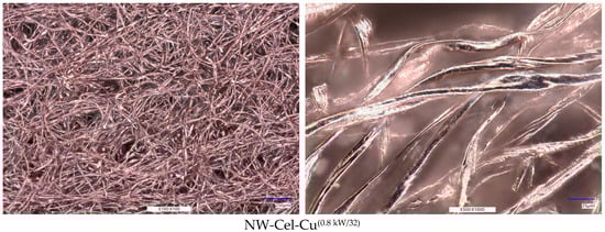 The digital optical microscopic images of the investigated samples are presented in Figure 2. The optical microscopy images show the visual difference between modified (NW-Cel-Cu) and unmodified samples (NW-Cel). It may be observed that the obtained copper coatings cover the surface of the fibers, and the Cu coating is uniform. The uniformity of the layer of Cu coating was confirmed by the determination of copper content tests (FAAS). The modification does not damage the fibrous structure of the samples, even with higher power and longer process duration (NW-Cel-Cu(0.8 kW/32)).