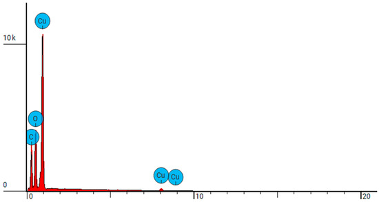 The samples were exposed to an electron beam within a scanning electron microscope, facilitating precise energy-dispersive X-ray spectroscopy (EDS). This technique not only enabled a thorough examination of the materials’ chemical composition but also provided an accurate assessment of their elemental makeup. With the EDS results, it was possible to precisely identify the elements within the sample by analyzing the position of peaks in the X-ray spectrum, where signal intensity correlated directly with the concentration of each element. The conducted analyses are comprehensively summarized in Table 3 and visually depicted in Figure 4, Figure 5, Figure 6, Figure 7 and Figure 8.