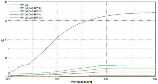 Comparison of transmittance spectra (%T) in the range λ = 200–800 nm of NW-Cel/NW-Cel-Cu samples is given in Figure 9.