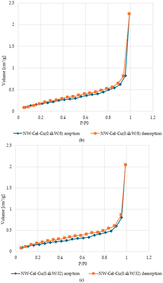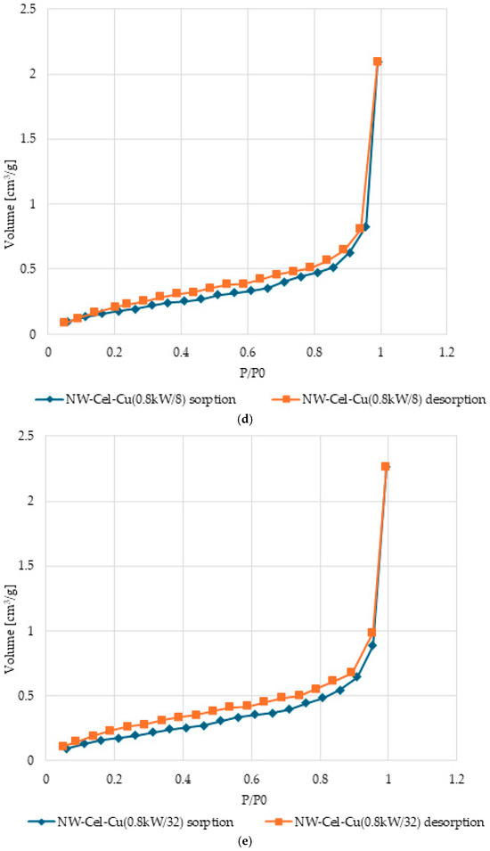 Obtained N2 adsorption-desorption isotherms for (a) NW-Cel, (b) NW-Cel-Cu(0.4 kW/8), (c) NW-Cel-Cu(0.4 kW/32), (d) NW-Cel-Cu(0.8 kW/8), and (e) NW-Cel-Cu(0.8 kW/32) samples.