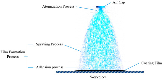 According to the time sequence, air spraying can be divided into an atomization process and a film formation process, as shown in Figure 2. In practical engineering applications, it is more concerned with film thickness and film uniformity in the film formation process, which can be further divided into a spraying process and an adhesion process. Accordingly, the aforementioned two processes are modeled, respectively.