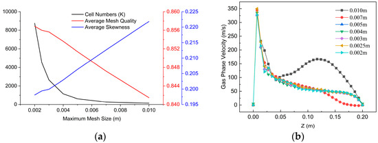 The polyhedra is selected for meshing, and #0 is selected for showing the mesh independence validation process. The validated mesh size, quantity, and quality are presented in Table 1, and the corresponding trends in mesh properties are illustrated in Figure 7a. It can be observed that the number of cell numbers drawn gradually increases, the average mesh quality gradually increases, and the average skewness gradually decreases as the maximum mesh length gradually decreases. In addition, the calculated axial gas phase velocities in the flow field with different mesh sizes were selected as a test basis, as shown in Figure 7b. It was found that the key features of the spray flow field could be accurately captured with a maximum mesh length of 0.002~0.005 m. In order to save computational cost and maintain good computational accuracy as a wall, the maximum mesh length of 0.003 m was selected for subsequent simulation calculations.
