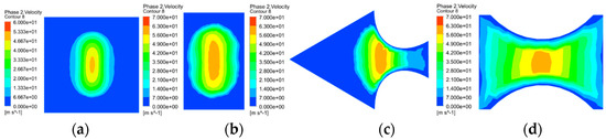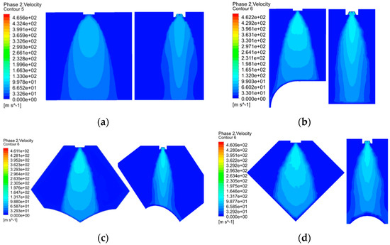 The spray flow field characteristics are described in terms of longitudinal velocity contours for the four spraying conditions, as depicted in Figure 8, with the YZ cross section on the left side and the XZ on the right of each figure. It can be observed that, under the four spraying conditions, the spray flow fields are expanded in the YZ plane and compressed in the XZ plane due to the airflow from the lateral pressure orifices. When the liquid-phase flow field is situated at a greater distance from the wall, the shape of the flow field in the four conditions shows similarity. Conversely, when the liquid-phase flow field is in closer proximity to the wall, the surface geometric characteristics of the four wall surfaces exert a great amount of expansion or compression on the flow field shapes. To illustrate, take the liquid-phase flow field of #3, for instance. In the YZ section, the flow field produces a significant compression due to the 90° cylindrical surface angle included on both sides, resulting in a smaller flow field range than others. In the XZ section, the liquid-phase flow field continues to develop along the wall after contacting the wall, resulting in a larger flow field range than the other three.