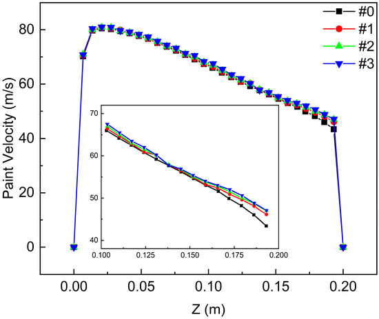 The longitudinal development of paint droplets in the spray flow field is reflected by analyzing the Z-axis paint velocity distributions for different spray cases, as shown in Figure 9. It can be observed that, following the injection of paint via the spray nozzle, the high-pressure airflow and the low velocity of the paint between the momentum transfers occur violently, the paint speed is rapidly accelerated to about 80 m/s, and the paint is rapidly atomized by the impact into fine liquid droplets. Subsequently, the propagation of the liquid phase is impeded by the gas phase, resulting in the dissipation of its kinetic energy. This process results in a gradual reduction in velocity from 80 m/s to 45 m/s. Upon collision with the wall, the droplet adheres, thereby impeding the propagation of the liquid phase. This results in a rapid decrease in velocity, reaching a value of 0 m/s. The inset in the figure illustrates the liquid-phase velocity curves when the Z-axis coordinate range is further narrowed to 0.1~0.2 m. It can be observed that the liquid-phase velocity of #0 is lower than the other three, likely due to the planar feature exerting a stronger hindering effect on the longitudinal spray flow field when the flow field is close to the wall. This results in a faster decay of the liquid-phase velocity, and different locations of the other three all have a certain extension effect on the development of the flow field. In other words, the droplets exhibit lower normal velocities in the near-wall regions of #1, #2, and #3, which makes them less of an impediment to the longitudinal spray flow field.