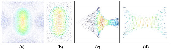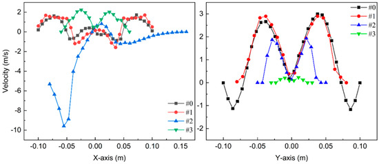 In order to gain insight into the velocity distribution characteristics of paint within the near-wall region, a velocity distribution curve is plotted along the X-axis and Y-axis, respectively, as illustrated in Figure 11. Meanwhile, the near-wall velocity vectors for the four work conditions are shown in Figure 12. It can be observed from Figure 11 and Figure 12. that, in the X-axis direction, the spray velocity distributions of #0 and #1 are similar and symmetrically distributed. However, due to the generation of a vortex near the origin, some of the velocities become negative, indicating the generation of backflow. In comparison to the other three, #2 exhibits a complex and asymmetric shape and surface features. The spray velocity distribution is notably different, exhibiting a substantial increase in spray velocity to −10 m/s in the negative direction, followed by a gradual decrease. This gradual decrease is observed thereafter. This is due to a smaller flow field space in the negative direction, which limits the longitudinal development of droplets and promotes transverse development. Consequently, the spray velocity displays significant variations. The spray velocity distribution of #3 is symmetrical, with the velocity increasing to a maximum value of 2 m/s in both positive and negative directions. Thereafter, the velocity gradually decays to 0 m/s owing to the momentum transfer between the gas and liquid phases. In the Y-axis direction, the spray velocities for all four conditions initially increase and subsequently decrease to zero in both positive and negative directions. However, the distribution ranges and values differ depending on the working conditions. The near-wall spray velocity distribution ranges and values for #2 and #3 are significantly smaller than those of the remaining two, which can be attributed to the fact that the velocity development in the Y-axis direction is hindered by the wall.