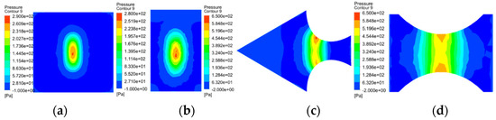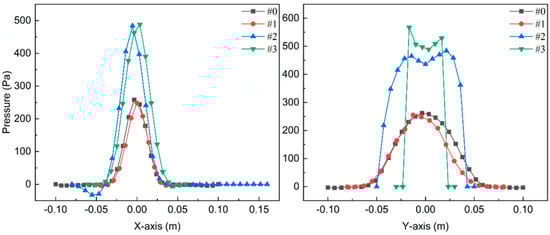 The pressure contours in the near-wall flow field are shown in Figure 13. The pressure in the near-wall flow fields of #0 and #1 reaches its maximum at the center of the spray cone and decays outward in an elliptical ring shape. The pressure outside the spray cone decreases to zero rapidly. By contrast, the pressure in the near-wall flow fields of #2 and #3 reaches its maximum near the wall surface and is distributed in a band-like attenuation pattern. The distribution curves of the near-wall flow field pressure along the X-axis and Y-axis are presented in Figure 14. In the X-axis direction, the pressure curves under the four spraying states exhibit a sharp decline from the origin to zero on both sides, with a pressure distribution ranging from −0.05 m to 0.05 m within the interval. Furthermore, the pressure peaks are observed to be concentrated in the vicinity of the origin. The pressure peaks of #2 and #3 reach 480~490 Pa, which are higher than the pressure peaks of #0 and #1 at 250~260 Pa. In the Y-axis direction, the pressures of #0 and #1 decrease symmetrically on both sides, with a peak pressure of 250 to 260 Pa. In contrast, the pressures of #2 and #3 initially increase and then decrease rapidly from the origin to both sides, with peak pressures of 490 Pa and 560 Pa, respectively. The discrepancy in the pressure peaks can be attributed to the wall surfaces of #2 and #3 in the near-wall region, which act as a direct obstruction to the flow field. This results in a buildup of pressure, in contrast to #0 and #1.