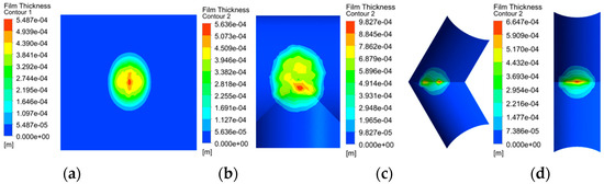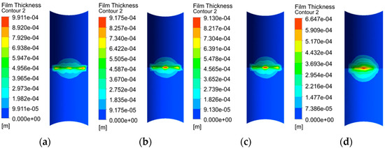 Film thickness contours of varying geometric dimensions. (a) D100; (b) D150; (c) D200; (d) D250.