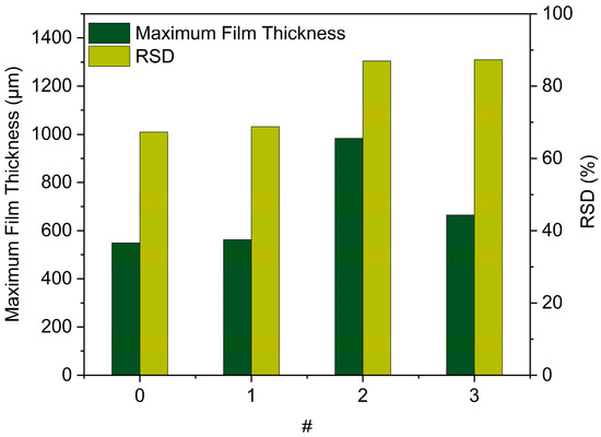 where is the average value of the data. The histograms of maximum film thickness and RSD for the four spraying states are presented in Figure 16. As the most common spraying condition, #0 exhibits an RSD value of 67.29%, which is the lowest of the four surfaces. In contrast, #1 exhibits a slightly higher RSD value of 74.79%, and the RSD values for #2 and #3 are 86.97% and 87.31%, respectively, thereby suggesting that the thickness uniformity of #1 is superior when spraying on UVICS. The film thickness peaks of the four spraying states are 548.7 μm, 563.6 μm, 982.7 μm, and 664.7 μm, respectively.