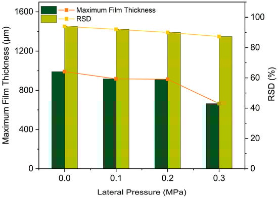 In order to obtain a high-quality coating film when spraying on different-sized workpieces, it is possible to adjust the lateral pressure of the spray gun. The shaping effect of compressed air on the spray flow field enables the aspect ratio of the coating film to be altered, thereby facilitating the control of the quality of the coating film. It is noteworthy that the predominant method of air spraying in the present era is the High Volume Low Pressure (HVLP) method [24]. This is due to the fact that its stable spraying amplitude enables effective improvement of transfer efficiency and reduction of overspray. Consequently, the lateral pressure should not be excessively elevated, and the lateral pressures were set to 0 MPa, 0.1 MPa, 0.2 MPa, and 0.3 MPa and designated as P0.0, P0.1, P0.2, and P0.3, respectively. The remaining spraying parameters were set as previously described, and the resulting contours of the film thickness distribution are presented in Figure 19. It can be observed that as lateral air pressure increases, the movement of paint droplets in the X-axis direction is compressed, while that in the Y-axis direction is expanded. This results in a significant change in the shape of the coating film, accompanied by a gradual reduction in the maximum thickness of the film due to an increase in the area covered by the coating film. Furthermore, the line-through indicates the presence of three relative maxima of coating film thickness in the coating film contours of P0.0, P0.1, and P0.2. As the lateral pressure increases, the width of the coating film distribution along the X-axis remains relatively constant, with values of 120 mm, 124 mm, 126 mm, and 122 mm, respectively. In the Y-axis direction, the length of the coating film exhibits a monotonically increasing trend with the increase in lateral air pressure. The thick film maxima and RSD of the coating films under the four lateral pressures are shown in Figure 20. The film thickness maxima demonstrate a decreasing trend, with values of 991.1 μm, 917.5 μm, 913.0 μm, and 664.7 μm, respectively. In addition, the trend of the RSD indicates that the lateral air pressure shows a positive effect on the homogeneity of the coating film, as evidenced by the observed decrease in the RSD. Consequently, the most uniform coating film effect is achieved when the side pressure is 0.3 MPa. In the case of other spraying parameters remaining unchanged, the lateral air pressure can be increased in an appropriate manner when spraying on UVICS, thus improving the uniformity of the coating film.