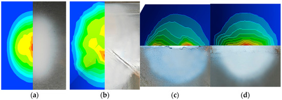 Firstly, the images of the coating films sprayed on #0, #1, #2, and #3, in comparison with the simulation results, are presented in Figure 23. Noticeably, orange-peel-like surfaces, sagging, graininess, and locally uneven surfaces did not occur on the coating surface. These images demonstrate that the shape of the coating film matches the numerical simulation results to a high degree, thereby confirming the higher degree of accuracy of the numerical simulation results.