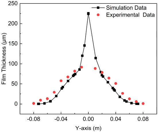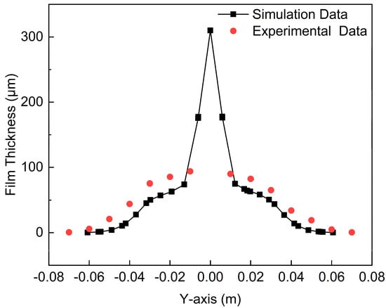 where hd is the dry film thickness, hm is the wet film thickness, η is the coating solid content, and the value of η here is 55%. It is regrettable that when measuring the thickness of the coating film in the area surrounding the line-through, the coating thickness gauge’s probe is unable to measure the line-through due to its unique groove structure. #3 was chosen to measure its coating film thickness in the Y-axis direction. After converting the numerically simulated coating film to dry film thickness, a comparison of the coating film thickness distribution between simulation and experiment is presented in Figure 24. This figure demonstrates that the experimental coating film thickness distribution is in good agreement with the numerical simulation. Within the ±10 mm Y-axis region, the experimental film thicknesses are found to be lower than those of numerical simulations. Conversely, the experimental film thicknesses outside this region are observed to be higher. Furthermore, the experimental film lengths are found to be slightly larger than those of the numerical simulations. The discrepancy between the two measurements can be attributed to the combined influence of gravity and surface tension. During the drying process, the wet film exhibits minor mobility, resulting in a slight lateral movement of the center of the coating film.