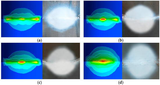 The shape of the coating film contours obtained by numerical simulation for spraying #0 to #3 is illustrated in Figure 15. The left and right directions in the contours correspond to the X-axis direction, while the top and bottom correspond to the Y-axis direction. The film shape of #0 is a typical ellipse obtained by air spraying, with the maximum of the film thickness located at the center. The film shape of #1 is an ellipse with irregular edges. This is due to the raised structure of cylindrical surfaces on the upper and lower sides, which interfere with the motion state of the paint droplets at the edge of the spray cone. The maximum film thickness is near the intersection of the line-through. The film shapes of #2 and #3 can be regarded as two semi-ellipses spliced together. However, the film thickness of #2 exhibits a bimodal distribution along the X-axis direction, with the peak of the film thickness of #3 situated at the center of the film.