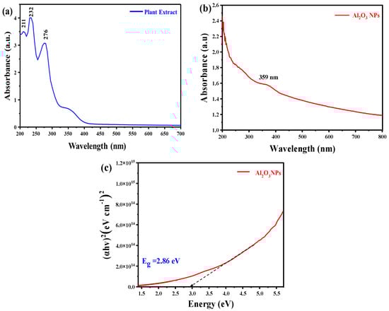UV-Vis spectra of synthesis materials: (a) Calligonum comosum L. extract, (b) Al2O3 nanoparticles, and (c) optical energy gap of Al2O3 nanoparticles.