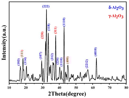 Distinct diffraction peaks are observed at specific 2θ values for γ-Al2O3 nanoparticles, 18.14°, 31.61°, 37.71°, and 45.08°, corresponding to crystal planes (111), (220), (311), and (400), respectively. Similarly, for δ-Al2O3 nanoparticles, peaks appear at 16.72°, 20.40°, 29.19°, 32.34°, 33.60°, 36.42°, 40.55°, 42.96°, 52.74°, 57.00°, and 62.24°, corresponding to crystal planes (103), (114), (107), (222), (118), (312), (226), (1110), (2210), (2212), and (4010), respectively. The absence of impurity peaks in the XRD spectra underscores the high purity of the Al2O3 nanoparticle samples [36].