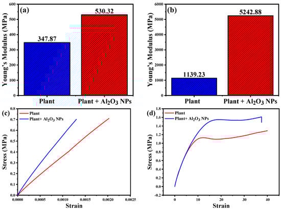 Young’s modulus flexural test stress (a,b) and compressive test (c,d) for samples (plant and plant + Al2O3 NPs).