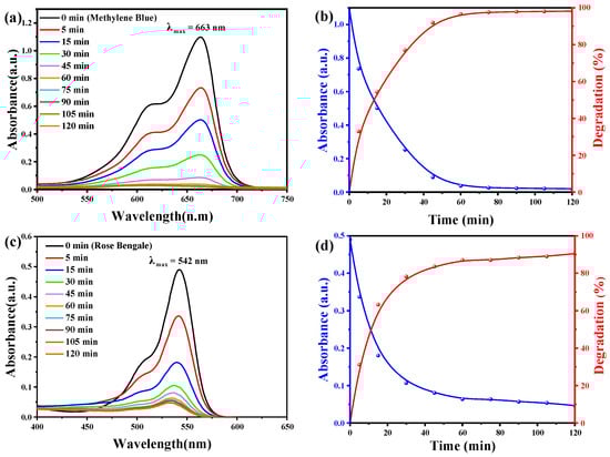 The degradation of methylene blue (MB) and Rose Bengal (RB) under solar light using pure Al2O3 nanoparticles is visually depicted in Figure 8a–d. Initially, distinctive absorption peaks are observed at approximately 663 nm for MB and 542 nm for RB. These peaks gradually diminish as the reaction proceeds, indicating a continuous degradation process over an extended period. Figure 8 illustrates the absorption spectra, demonstrating a visible decrease in peak intensities for both dyes, accompanied by a fading of their vibrant colors over time.