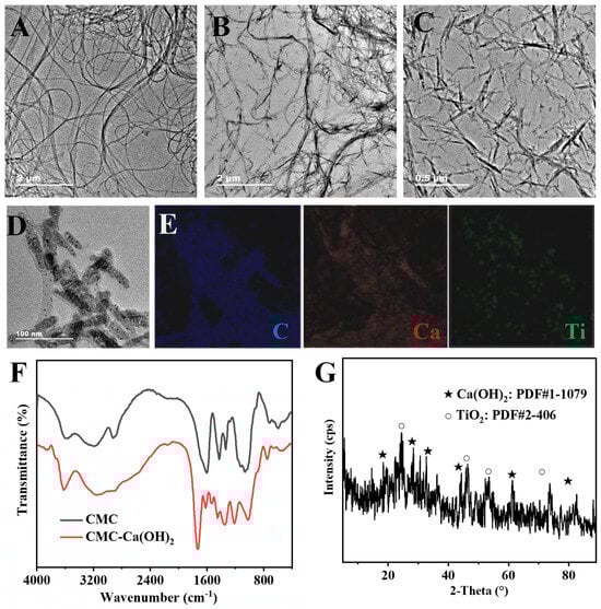 (A) TEM of CMC. (B–D) TEM of CMC-Ca(OH)2-TiO2. (E) Corresponding element maps of CMC-Ca(OH)2-TiO2. (F) IR spectrum of CMC and CMC-Ca(OH)2. (G) XRD of CMC-Ca(OH)2-TiO2.