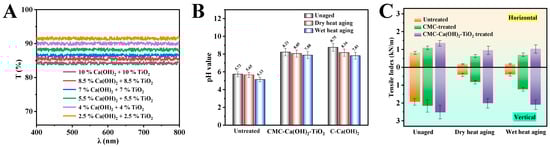 (A) The light transmittance test was conducted by adding varying contents of Ca(OH)2 and TiO2. (B) pH changes in paper after dry heat and humid heat aging with C-Ca(OH)2 and CMC-Ca(OH)2-TiO2 treatments. (C) Changes in horizontal and vertical tensile indices of paper treated with CMC and CMC-Ca(OH)2-TiO2 after dry heat and wet heat aging.