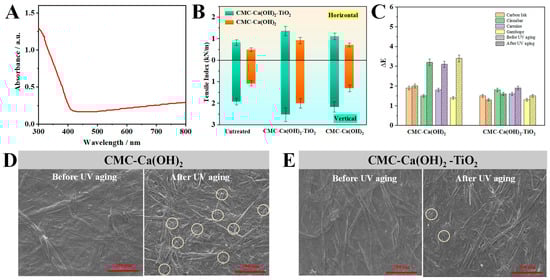 (A) UV diffuse reflectance spectroscopy test of CMC-Ca(OH)2-TiO2 hybrid material. (B) Changes in horizontal and vertical tensile indices of paper treated with CMC-Ca(OH)2 and CMC-Ca(OH)2-TiO2 after UV effect. (C) Changes in color difference of carbon ink, cinnabar, carmine and gamboge pigments treated with CMC-Ca(OH)2 and CMC-Ca(OH)2-TiO2 before and after UV effect. (D,E) SEM images of paper treated with CMC-Ca(OH)2 and CMC-Ca(OH)2-TiO2 before and after UV effect (fiber fractures are circled).
