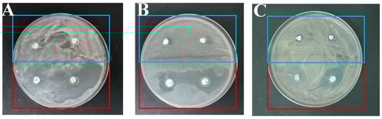 (A) Antibacterial test of CMC-Ca(OH)2 hybrid material and CMC-Ca(OH)2-TiO2 hybrid material against Aspergillus flavus. (B) Antibacterial test of CMC-Ca(OH)2 hybrid material and CMC-Ca(OH)2-TiO2 hybrid material against Aspergillus niger. (C) Antibacterial test of CMC-Ca(OH)2 hybrid material and CMC-Ca(OH)2-TiO2 hybrid material against Alternaria altenata (blue for CMC-Ca(OH)2 and red for CMC-Ca(OH)2-TiO2).