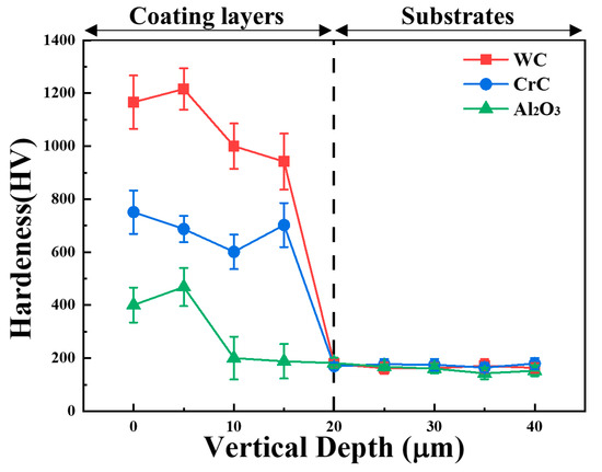 Vertical distribution of micro Vickers hardness from the top surface of the coating layers to the substrate.