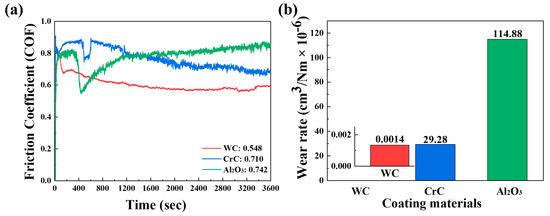 Figure 4a,b show the wear rate based on the volume loss and the varying friction coefficient of the specimens after the wear test. The wear test results indicate that the wear rate follows the same order as the hardness results, with Al2O3, CrC, and WC showing decreasing wear rates, respectively. The variations in the friction coefficient graph are attributed to the increase (decrease) in the friction coefficient caused by wear debris (porosity). As shown in area fraction analysis, the WC material, which has fewer defects, exhibits uniform variations of microhardness. The average friction coefficients for the WC, CrC, and Al2O3 materials are 0.548, 0.710, and 0.742, respectively. The friction coefficients of the WC and CrC materials stabilize over time, indicating increasing friction resistance [25]. The CrC and Al2O3 materials exhibit rapid fluctuations compared to WC due to the significant number of cross-sectional defects, such as pores and cracks, which trap wear debris generated during the wear process and affect subsequent wear cycles. Notably, Al2O3 shows a continuously increasing variation in the friction coefficient.