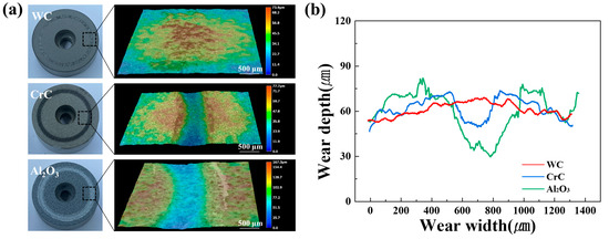Figure 5a,b show the 3D and 2D profiles of the wear track width and depth. The depth and width of the tracks increase in the order of WC, CrC, and Al2O3, correlating with the increase in wear loss rate. The 3D profile results in Figure 5a reveal that the surface of the CrC and Al2O3 coatings was indented by the counter material, whereas the WC surface appeared to be healed and convex. The analysis of the wear track depth (D) and width (W) using the 3D profiles in Figure 5b shows that the WC, CrC, and Al2O3 materials have wear track depths and widths of 7.7 µm (D) and 626.6 µm (W), 42.4 µm (D) and 2120.6 µm (W), and 24.0 µm (D) and 1472.1 µm (W), respectively. The WC material exhibits the least damaged wear track, suggesting it is the most effective coating layer for protecting the substrate.