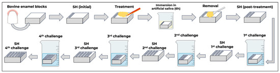Schematic diagram illustrating the experimental design of the study. SH = surface hardness. The erosive challenges were performed by immersing the blocks in citric acid (0.75%, pH = 3.5, 1 min for each challenge).