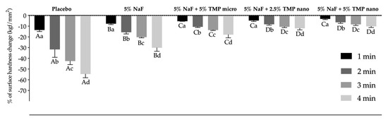 Statistically significant differences were observed among the varnishes (F = 366.0, p < 0.001), times of exposure to acid (F = 655.3, p < 0.001), and for the interaction between these variables (F = 109.1, p < 0.001). At 1 min of exposure to acid, the highest surface hardness change was observed for the Placebo, followed by 5% NaF and the TMP-containing varnishes (p < 0.05), without differences among the latter regardless of the type of particle (micro or nano) or TMP concentration (2.5 or 5%). At 2, 3, and 4 min, statistically significant differences were observed among the Placebo, 5% NaF, 5% NaF/5% TMP micro, and both varnishes containing TMP nano; however, there were no statistically significant differences between 2.5% and 5% TMPnano containing varnishes. Also, at these timepoints, the 5% NaF group demonstrated statistically significantly lower enamel softening compared to the Placebo group, while the 5% NaF/5% TMP micro treatment showed a superior effect to 5% NaF alone. Furthermore, TMPnano treatment resulted in the smallest amount of enamel softening, regardless of concentration. As for the durations of exposure to acid, statistically significant differences were observed among all times for all varnishes tested (Figure 2).
