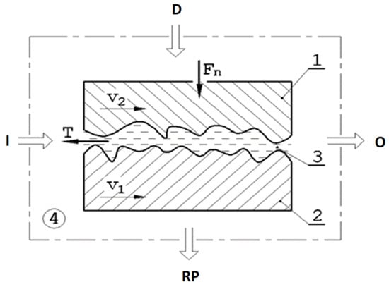 Tribological system [5]; designations: 1—relative motion inducing element, 2—element subject to kinematic forcing, 3—intermediate layer, 4—further surrounding, D—disturbances, Fn—load, I—preset input values (X), O—effective output values (Y), RP—residual processes, T—friction forces, v1 and v2—surface velocities of elements 1 and 2.