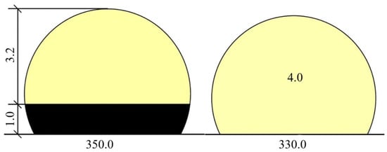 As aforementioned, the mineral composition of the rock mass in which dog headings are driven can be diversified and variable along the entire driving section. This is precisely the situation presented and discussed by Mucha [20] using an example of driving through a mass of rock and coal in order to develop an inclined ventilation drift in one of the Polish coal mines. The geological cross-sections provided in Figure 3 formed layers of coal and sandstone (left-hand figure) and sandstone alone (right-hand figure).