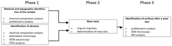 The research was divided into three phases: identification of the materials and abrasives used, basic wear tests, and analysis of surface damage (the research scheme is presented in Figure 4).