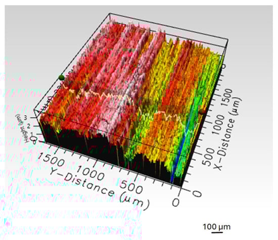 The tribological test samples were made from a wear-resistant steel with the trade name of RAEX400. The main material data of the steel subject to the tests are provided in Table 1, while its chemical composition is provided in Table 2. Detailed information on the steel used in the studies can be found in papers [68,69]. The surface profilogram of the RAEX400 steel is shown in Figure 5.
