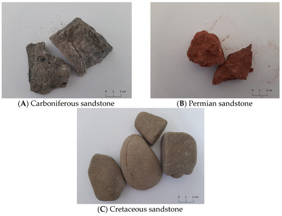 Carboniferous sandstone (Figure 7A) is characterised by its grey colour, medium-grained texture, and low degree of sorting. The sandstone texture is compact, typically chaotic, only locally with directional texture marked by the presence of fine-grained parallel layers of carbonaceous matter. In a sample comprising chunks of material, sandstone reacts with HCl when exposed to cold, which implies that there is calcite (CaCO3) in the mineralogical composition of the cement, and moreover, a distinct odour of mortar is released when the rock comes into contact with water, which, in turn, indicates the presence of clayey minerals.