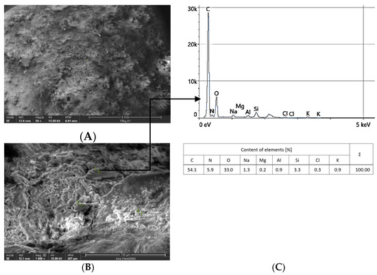 Cretaceous sandstone surface: (A) microscopic view (×44, SEM); (B) microscopic view (×1000, SEM); (C) EDS analysis results for item 1 with chemical analysis.