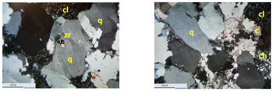 Microphotograph of Carboniferous sandstone (in transmitted light, crossed polarisers, ×100); designations: q—quartz, cl—clayey minerals; c—carbonates, ch—chalcedony, zr—zirconium.