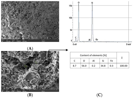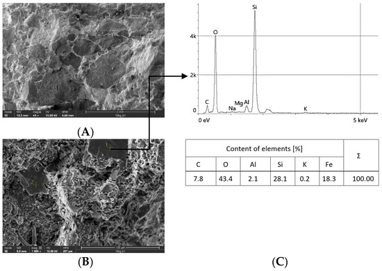 Carboniferous sandstone surface: (A) microscopic view (×30, SEM); (B) microscopic view (×1000, SEM); (C) EDS analysis results for item 1 with chemical analysis.