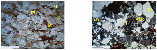 Microphotograph of Cretaceous sandstone (in transmitted light; (left) parallel polarisers, (right) crossed polarisers, ×100); designations: q—quartz, cl—clayey minerals, c—carbonates, f—feldspars, ch—chalcedony, m—muscovite, bt—biotite, g—glaukonite.