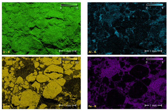 Having performed the microscopic observations and spot EDS measurements, the authors also established the surface distribution of elements. A sample distribution obtained for the Permian sandstone is shown in Figure 14, and the elements were mapped for the sandstones studied (Figure 15). Figure 16 shows the surface of the quartz sand used in the studies. Additionally, the sandstones subject to testing were also analysed for chemical composition (Table 4).