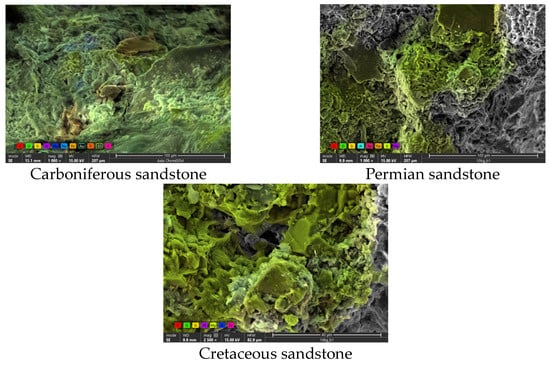 The binder of the Carboniferous and Cretaceous sandstones represents a porous type, while in the Permian sandstone, basal binder was observed. In all sandstones, binder creates a mixed cement type; no matrix type was found. In the Cretaceous sandstone, similarly to the Carboniferous sandstone, the cement is of the mixed clay–carbonate–silica type, but the participation of a mineral belonging to the clay mineral group—glauconite—is worth noting. The most characteristic feature of glauconite in the microareas is its green colour under parallel polarizers (Figure 13).