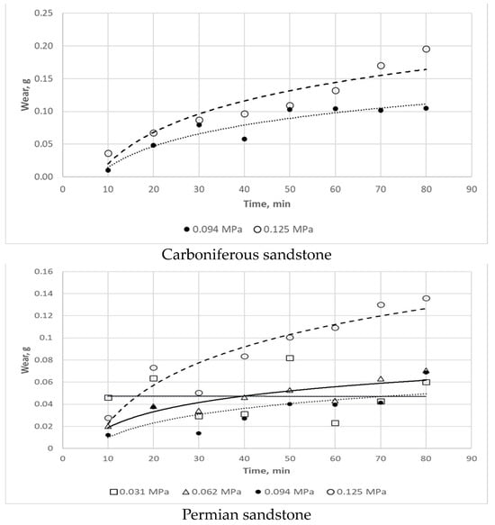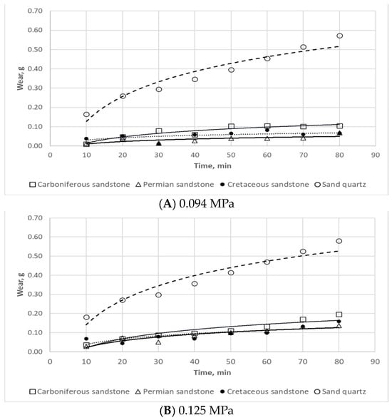 Comparison of curves of mass decrement (WM) of wear-resistant steel for the sandstone varieties examined: (A) for 0.094 MPa of load, (B) for 0.125 MPa of load.