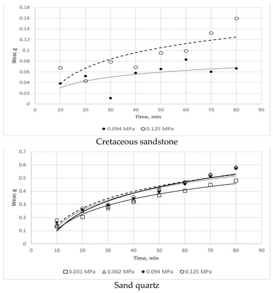 Figure 16 illustrates the behaviour of mass decrement as a function of testing time for the sandstone varieties and quartz sand examined, while Figure 17 provides a comparison of wear curves for the sandstone varieties in question.