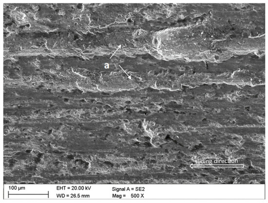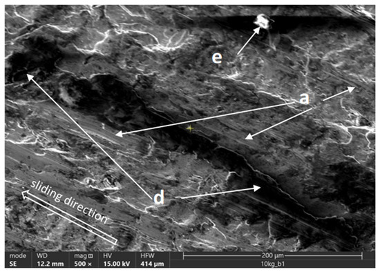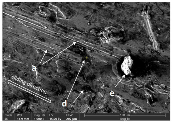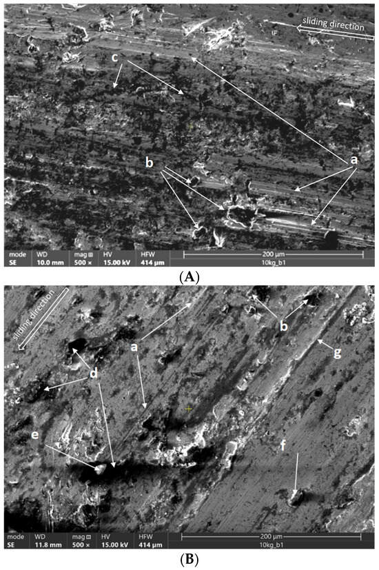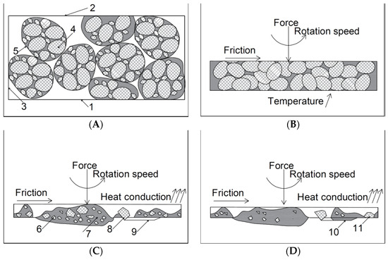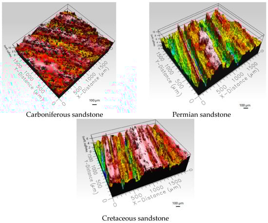 However, what proves to be more frequent is the effect of either dry (Figure 2B) or wet abrasive material (Figure 2C,D), which can cause significant material decrement precisely at the point of impact of this degradation factor. Material decrement in the surface layer can be due to such processes as micro-ridging, micro-scratching, micro-fatigue, and micro-cracking [10]. In the case of abrasives composed of minerals characterised by considerable hardness, damage is typically attributable to micro-scratching or micro-ridging.