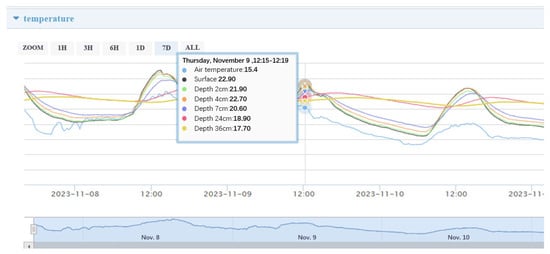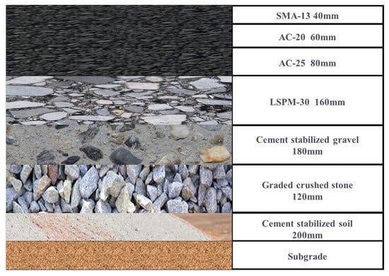The test section is located at Qingdao, Shandong Province, and is a segment of the Qingdao to Linyi Expressway. The structure is a multilayer pavement system with four asphalt layers, cement-stabilized gravel stones and a cement-stabilized subgrade. The asphalt layer consists of 40 mm SMA-13 (Stone Mastic Asphalt), 60 mm AC-20 (Asphalt Concrete), and 80 mm AC-25 and 160 mm LSPM-30 (Large Stone Porous Mixture), as depicted in Figure 1. A weigh-in-motion (WIM) system and temperature monitoring system are installed within the pavement, as illustrated in Figure 2 and Figure 3, allowing for the acquisition of traffic axle load information and temperature data from various pavement structural layers. Figure 3 showed a temperature profile of an asphalt pavement structure of different depths in three days, and the temperature value at a specific chosen moment., The material performance parameters for each pavement layer are presented in Table 1, according to the project information. To calculate the dynamic modulus under varying seasonal temperatures, the measured temperature from the monitoring system and the master curve of the dynamic modulus of asphalt mixtures in different structural layers were used. The frequency of 10 Hz was chosen, which was equivalent to a speed of 70 kM/h [25]. The average calculated dynamic modulus is presented in Table 2.